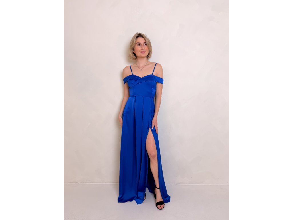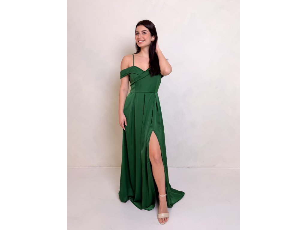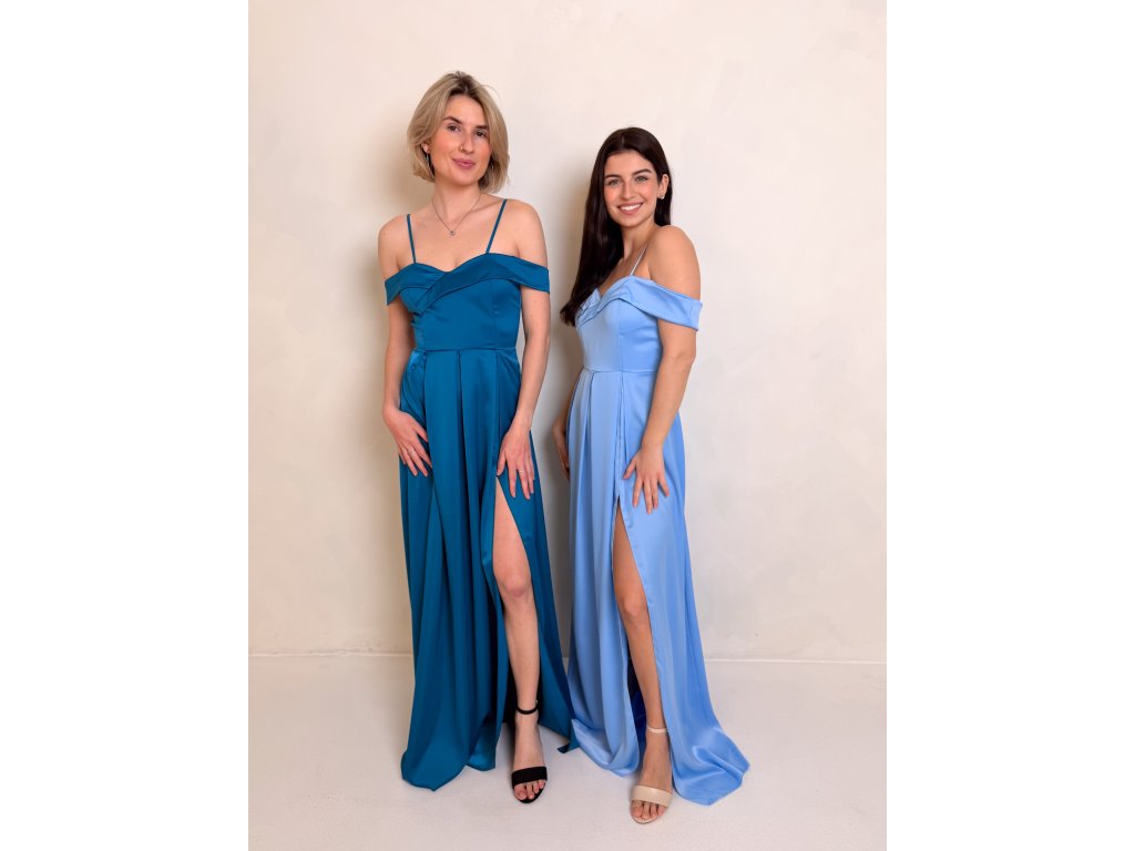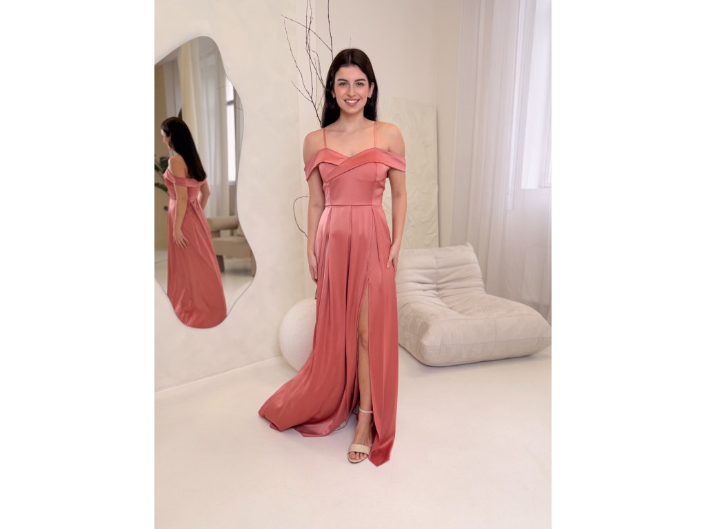 Dlouhé saténové šaty s rozparkem a spadlými rameny.
