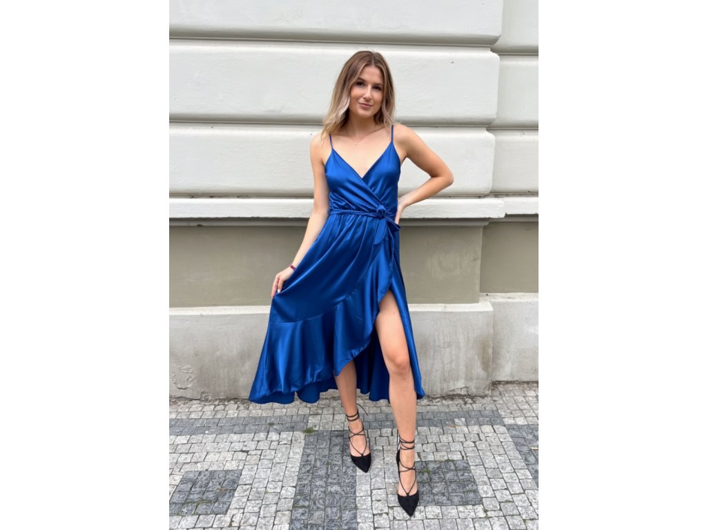 Dlouhé satin šaty s rozparkem, volány a tenkými nastavitelnými ramínky.