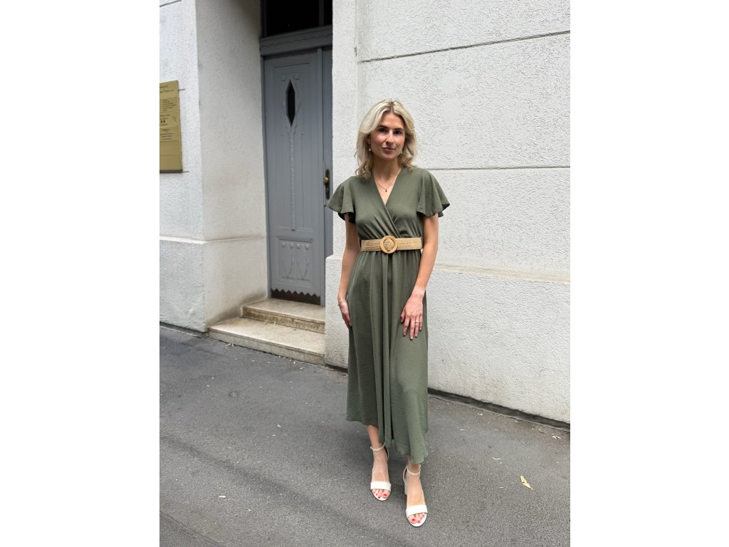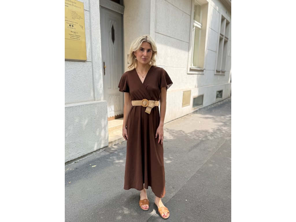 Dlouhé šaty s rukávky a páskem.