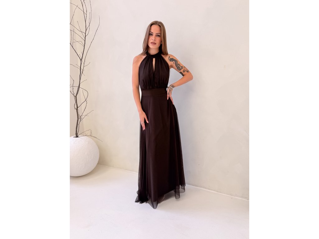 Dlouhé tylové šaty Adriana - čokoládová barva