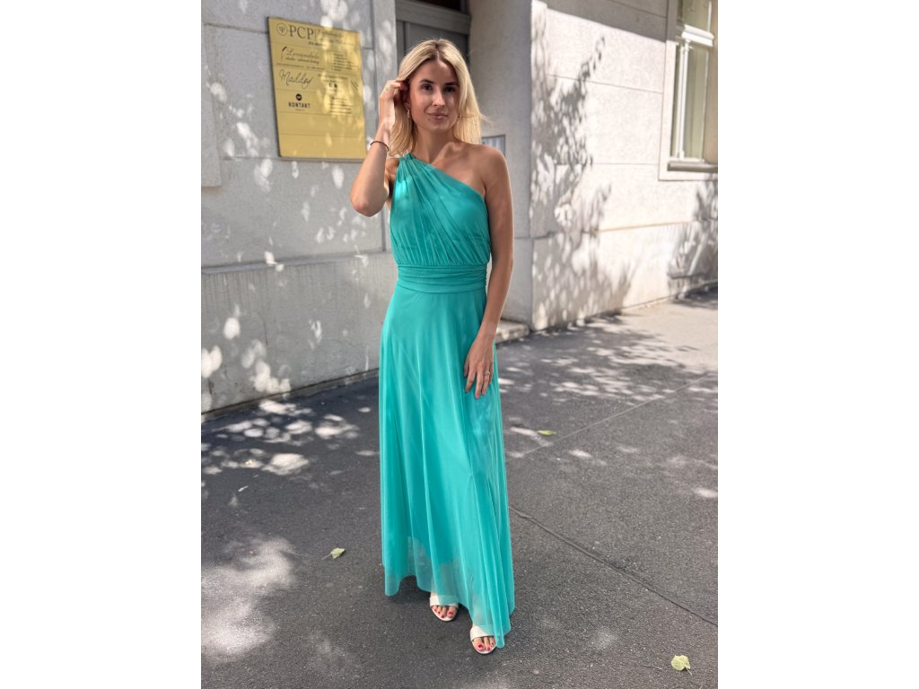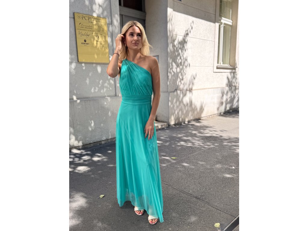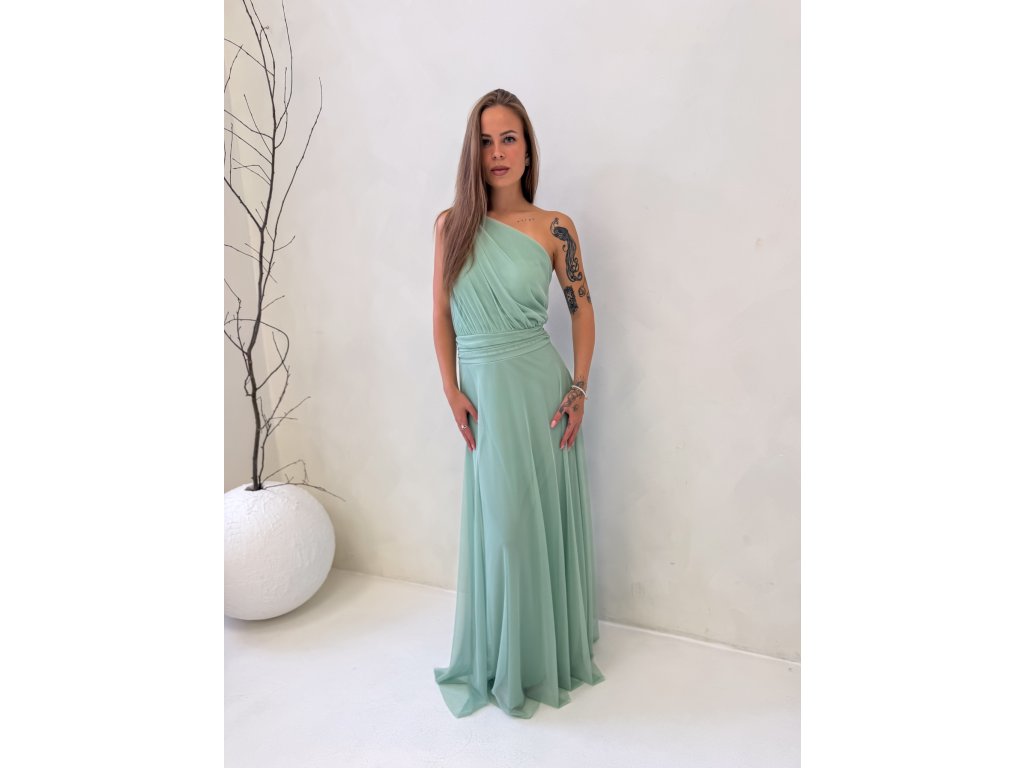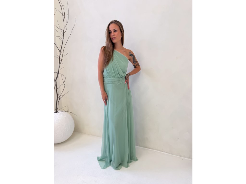 Dlouhé tylové šaty s vycpávkami, na jedno rameno.