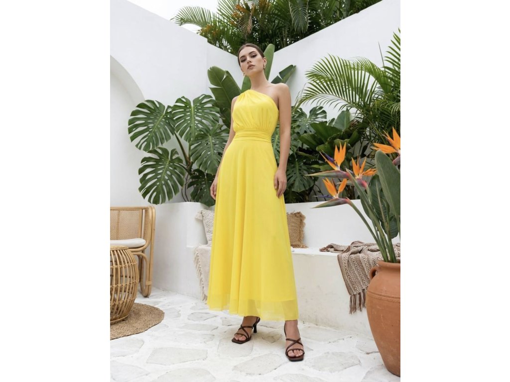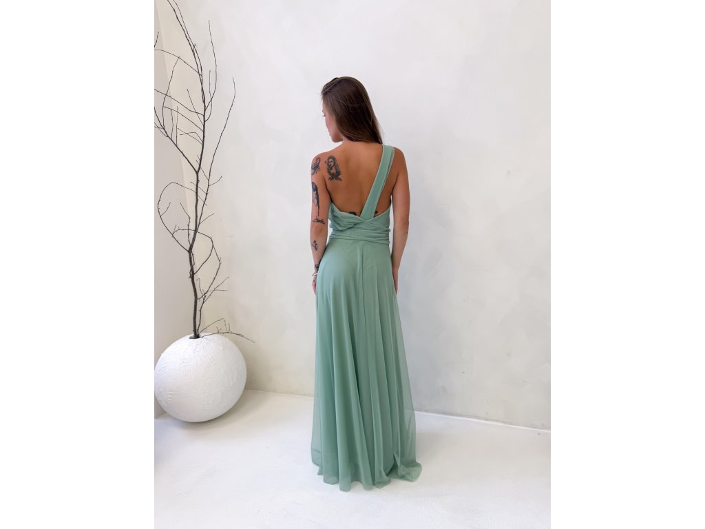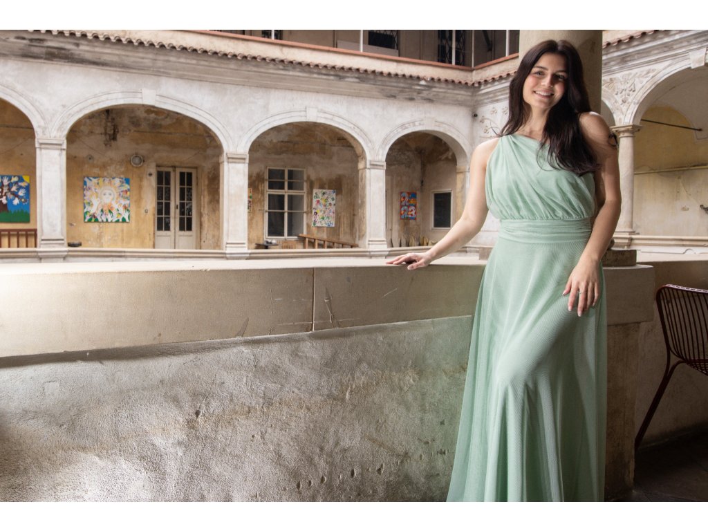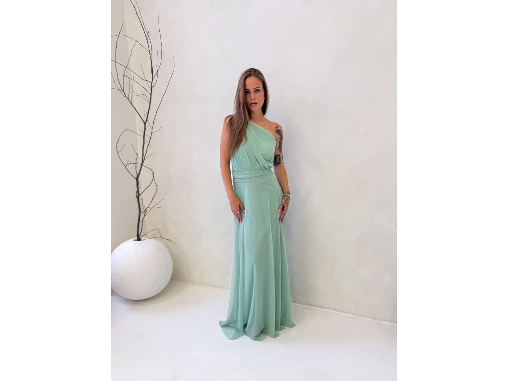 Dlouhé tylové šaty s vycpávkami, na jedno rameno.