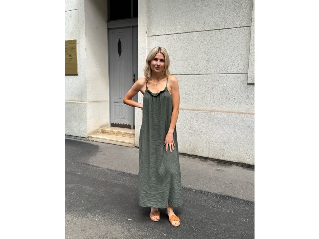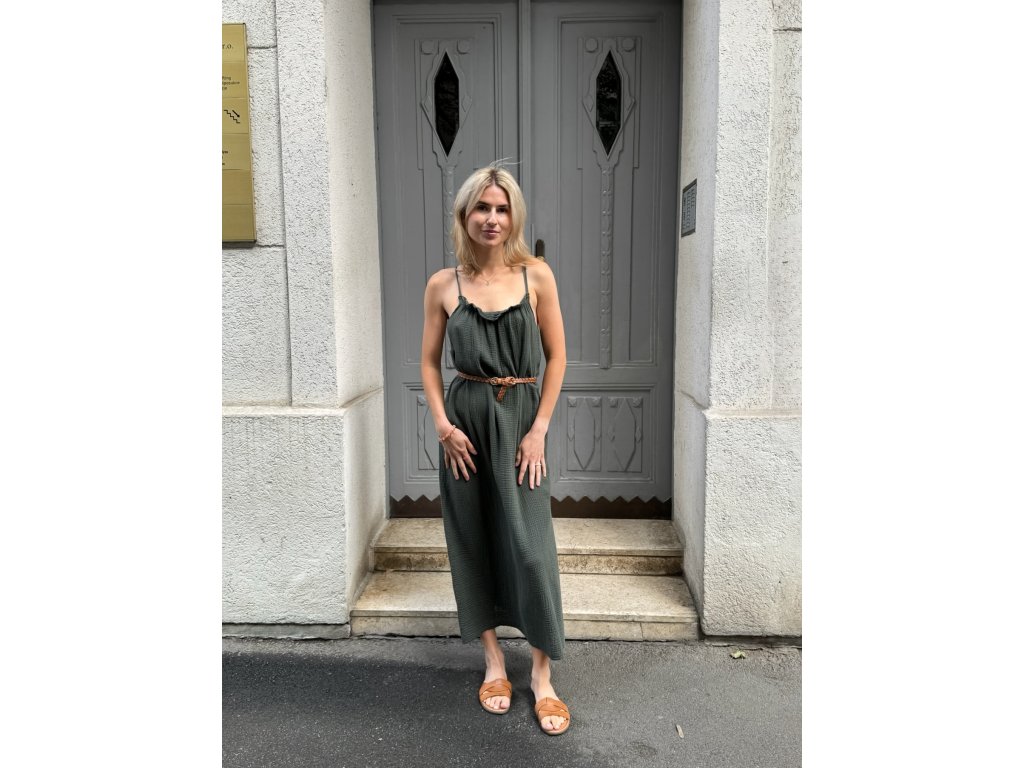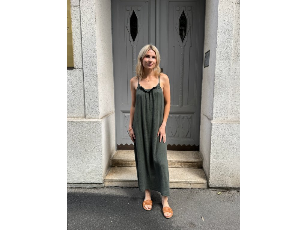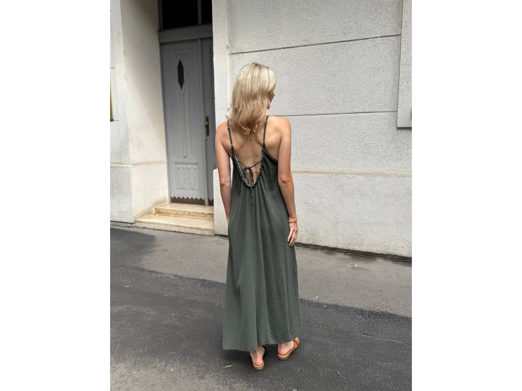Volné mušelínové šaty s nastavitelnými ramínky a vázáním na zádech.