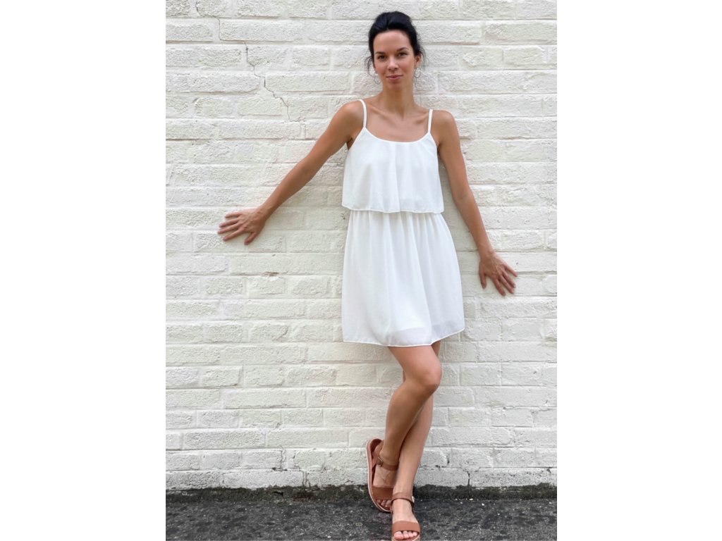 Krátké šaty na tenká ramínka s volánkem, s gumou v pase.