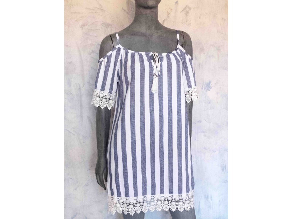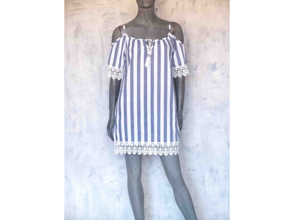 Volné proužkované šaty s odhalenými rameny a krátkým rukávem.