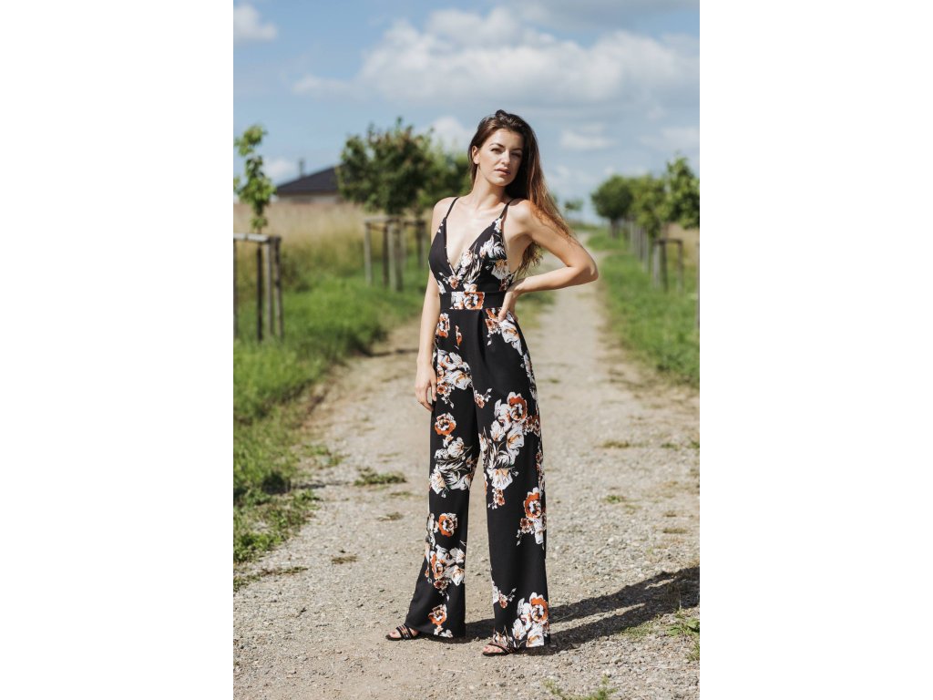 Dlouhý kytkovaný overal se širokými nohavicemi, tenkými ramínky a zavazováním na zádech.