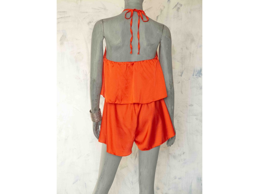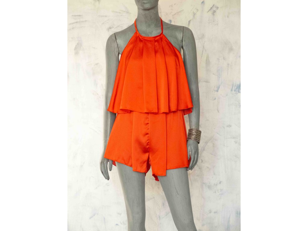 Krátký saténový overal se zavazováním za krkem a holými zády.